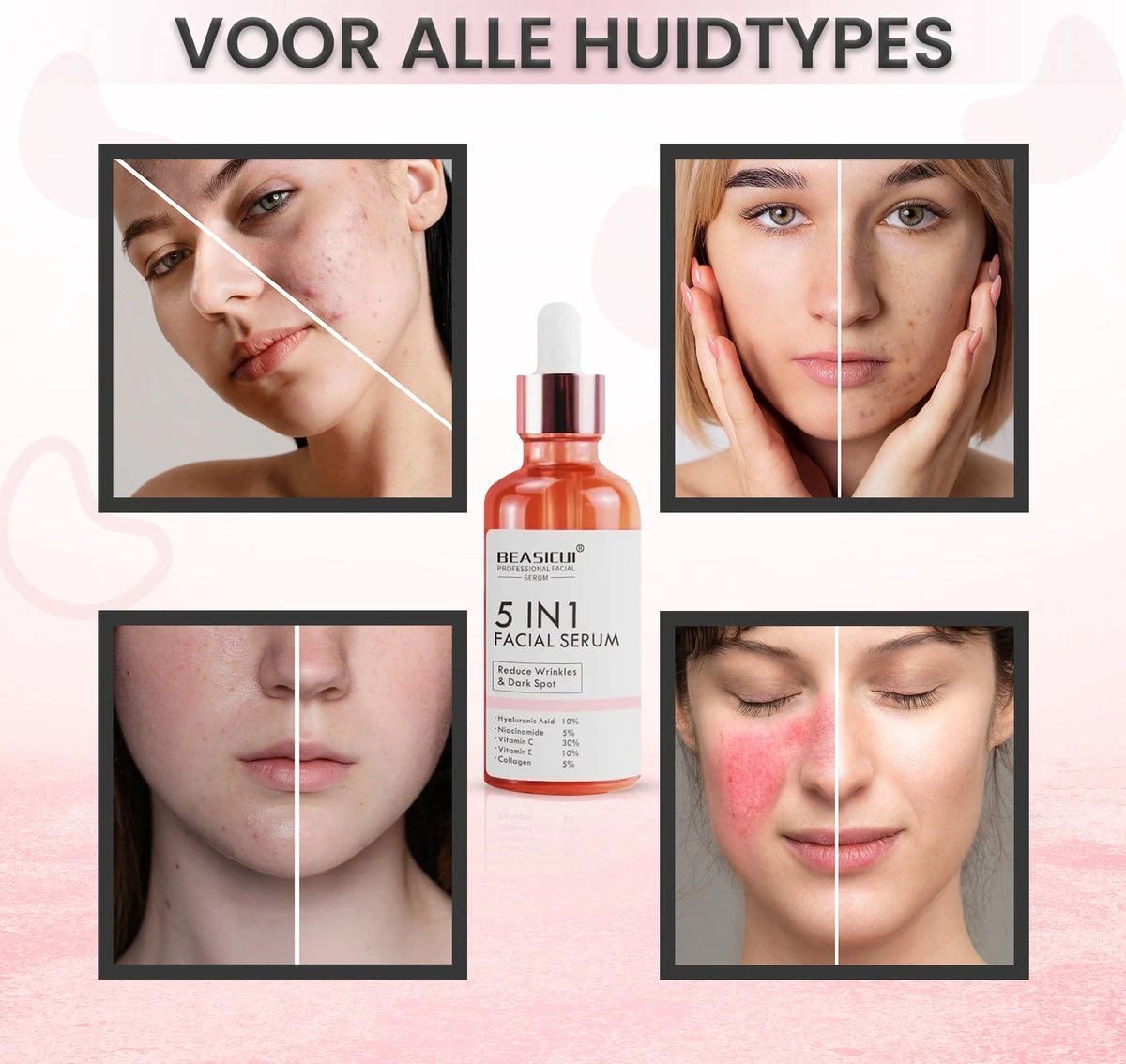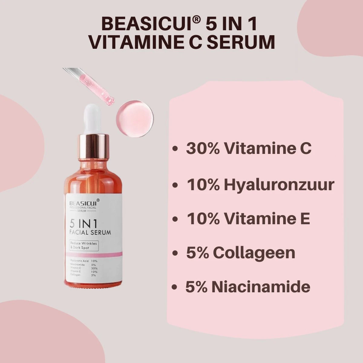 Onze formule bevat 30% pure vitamine C, een krachtige antioxidant die uw huid helpt te verhelderen en donkere vlekken en verkleuringen te verminderen. Bovendien stimuleert deze hoge concentratie vitamine C de collageenproductie, waardoor uw huid steviger en jeugdiger wordt.