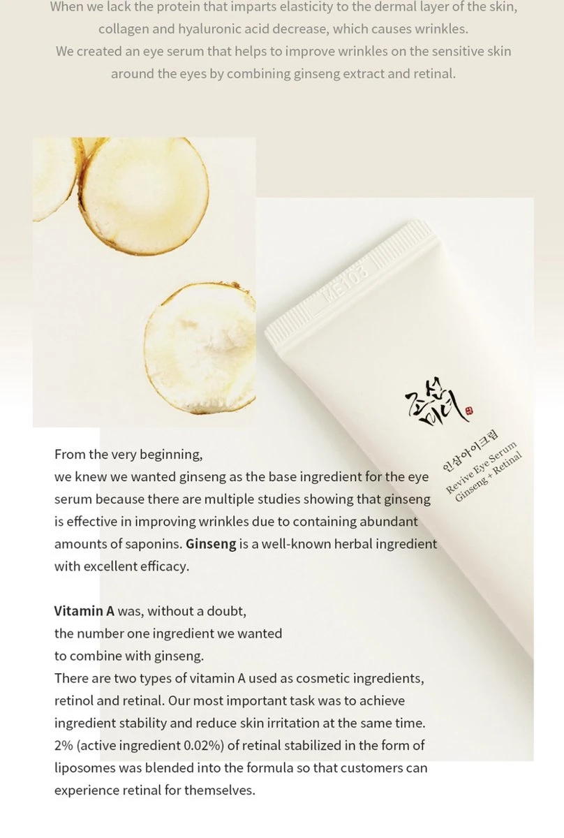 Wrinkle-improving serum for around the sensitive eye area from the Korean skincare brand Beauty of Joseon. The serum is enriched with Ginseng and Retinal, which help to firm, smooth and revitalize the eye area, leaving it supple & glowing. In addition, Ginseng Root Extract has antioxidant benefits, boosts hydration, and helps visibly improve signs of skin aging. Retinal firms and brightens skin complexion by stimulating collagen production and reducing fine lines and wrinkles. It has a silky texture that spreads softly and blends easily into the skin to provide a feeling of nourishment and suppleness, yet leaves no stickiness after use.