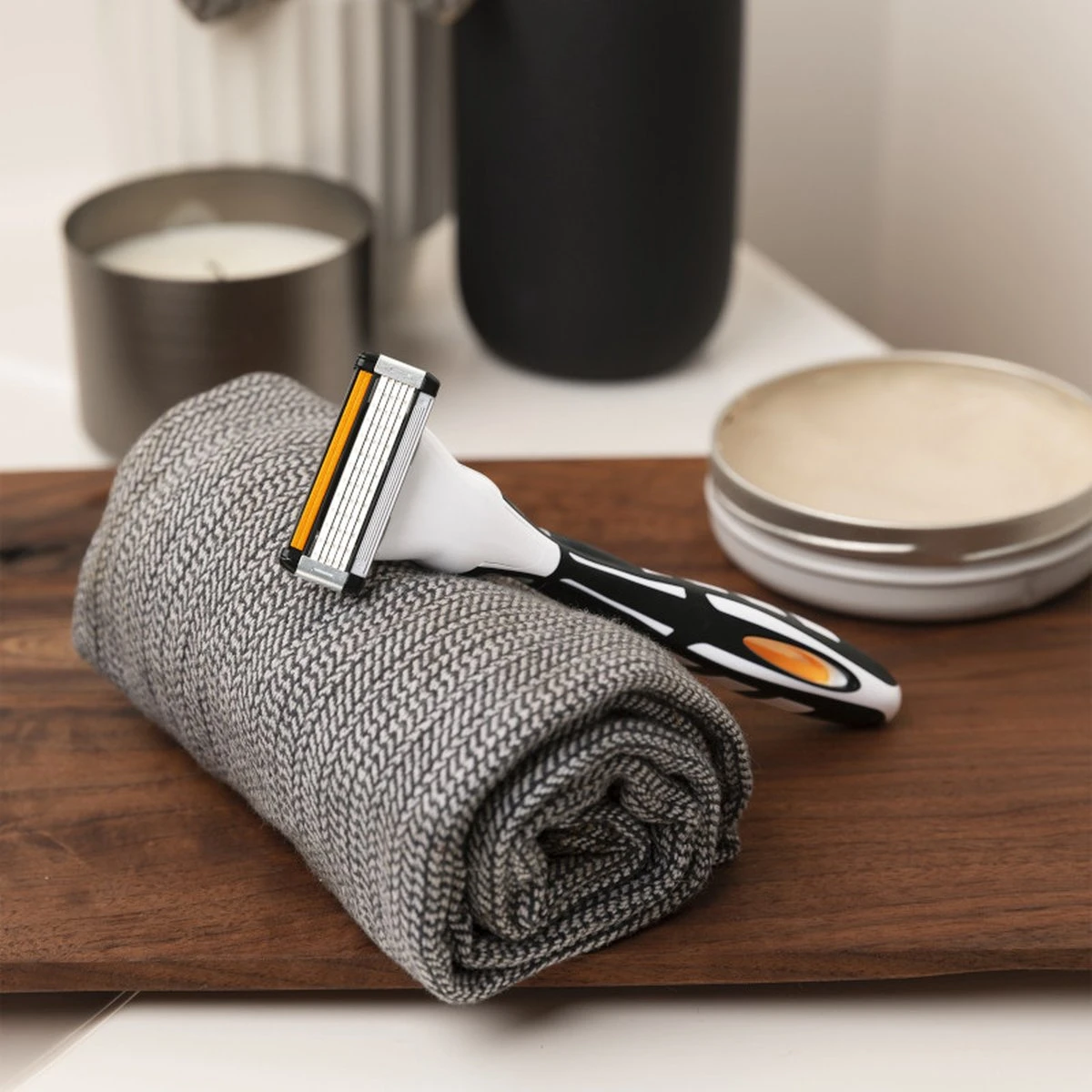 - Het multigrip handvat, dat is verzwaard met een bol voor de balans, geeft een zelfverzekerde controle bij het scheren