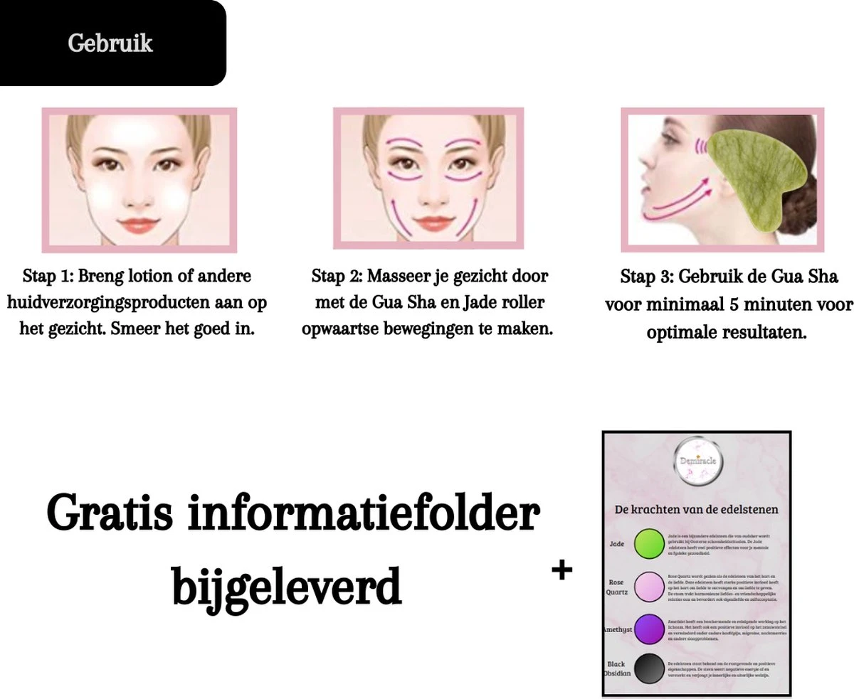 - Gebruik de steen tijdens de Gua Sha massage altijd zachtjes, om te voorkomen dat je krassen in je gezicht krijgt.