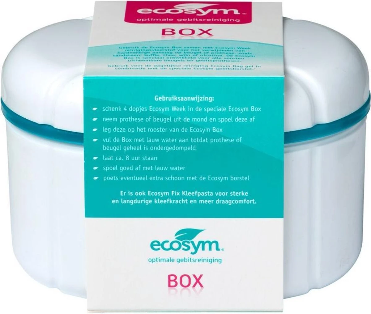 Ecosym Gebitsbakje is speciaal ontworpen voor de wekelijkse reiniging van uitneembare gebitsprothesen en beugels in combinatie met Ecosym Week Forte. De voordelen van Ecosym Box: – Voor optimale reiniging van gebitsprothesen en beugels – Voor het verwijderen van hardnekkige aanslag zoals koffie, wijn en nicotine – Eenvoudig en makkelijk. Ecosym wordt aanbevolen door tandarts en tandtechnicus.