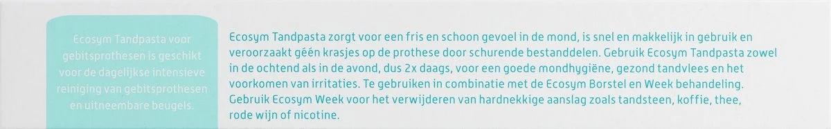 Ecosym Tandpasta voor gebitsprothesen voor de dagelijkse reiniging van jouw gebitsprothese of beugel. Om zo lang mogelijk plezier te houden van uw prothese of beugel is goed onderhoud belangrijk. Reguliere tandpasta is niet geschikt voor de reiniging van prothesen, beugels of sportbitjes. Reguliere tandpasta heeft namelijk een schurende werking en veroorzaakt krasjes en ruwe oppervlakten en kunnen vuil en bacteriĆ«n zich makkelijker hechten op jouw prothese of beugel. En reiniging met alleen water is geen goede hygiĆ«nische reiniging. Reinig daarom dagelijks jouw prothese of beugel met Ecosym Tandpasta. Deze tandpasta bevat gƩƩn schurende ingrediĆ«nten. De voordelen van Ecosym Tandpasta voor gebitsprothesen: – Optimale reiniging voor iedere dag – Veroorzaakt gƩƩn krasjes op de gebitsprothese – Snel en gemakkelijke reiniging – Schoon en fris gevoel in de mond – Geschikt voor gedeeltelijke en volledige gebitsprothese, uitneembare beugels en sportbitjes. Ecosym wordt aanbevolen door tandarts en tandtechnicus.