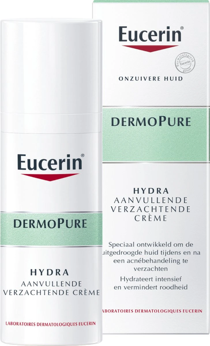 De Eucerin DermoPure Hydra kalmeert en biedt intense hydratatie aan een huid die medisch wordt behandeld voor acne. Het is een hydraterende crème voor de acnegevoelige huid die de (uitdrogende) bijwerkingen van acnemedicatie verlicht. Het product bestaat uit een intens hydraterende, niet-plakkerige formule die irritatie kalmeert, trekkerigheid vermindert en je zo helpt jouw onzuivere huid onder controle te houden.