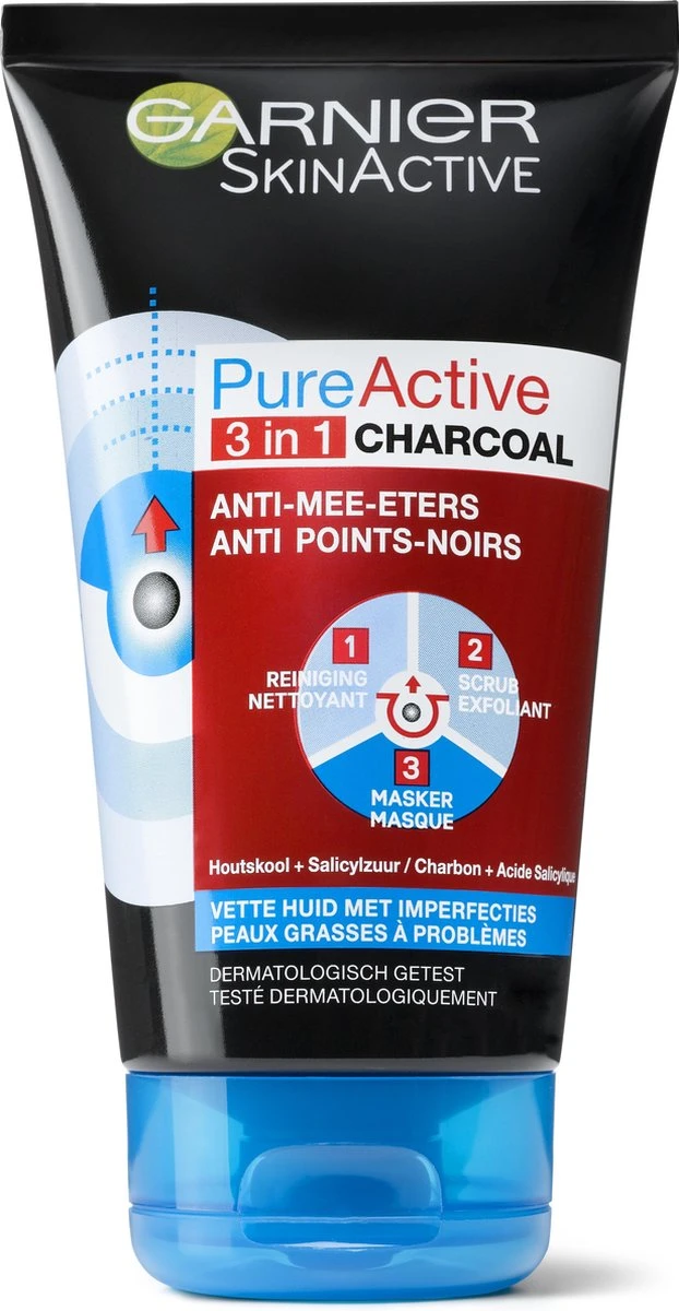 Deze innovatieve formule van Garnier Pure Active Charcoal 3-in-1 met actief houtskool kan als een reiniging, scrub of masker gebruikt worden om zichtbaar mee-eters en (jeugd)puistjes te verminderen en te voorkomen.
