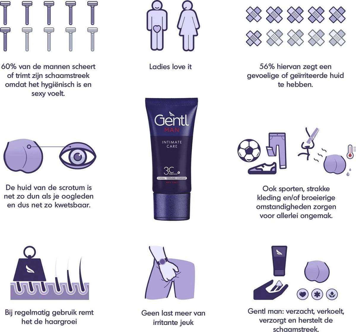 Gentl man verzacht en verzorgt de kwetsbare huid van de schaamstreek. De crème is dermatologisch getest en geschikt voor de meest gevoelige huid.