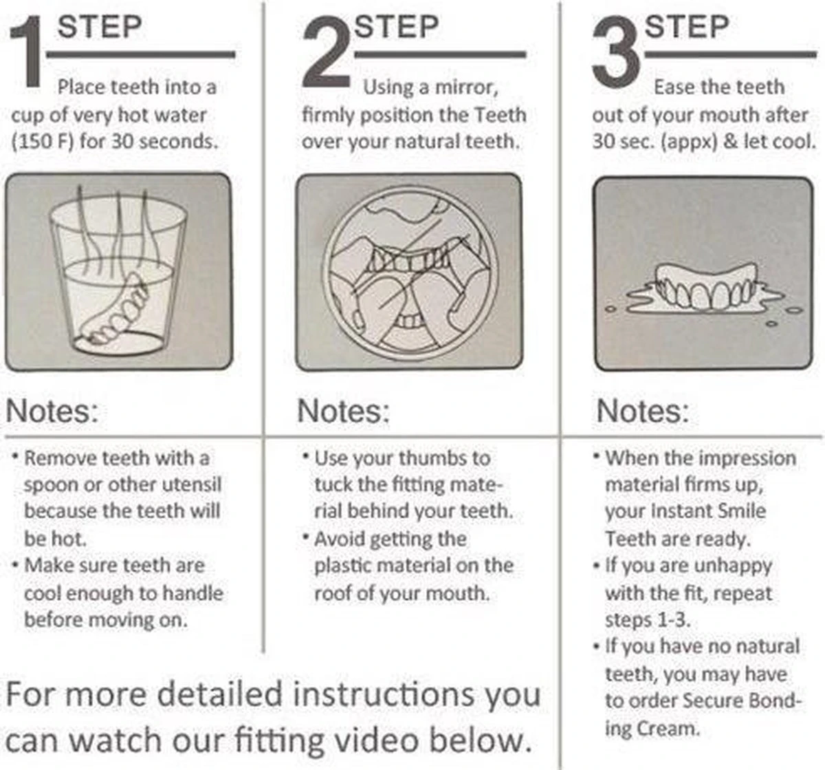 InstantSmile wordt geleverd met een bitje van siliconen: een beetje vergelijkbaar met de bitjes die boksers dragen. Deze zorgen ervoor dat jouw kunstgebit zich binnen vijf minuten naar je werkelijke gebit vormt. Dompel het bitje hiervoor in warm water. Lukt het niet? Geen zorgen. De handeling is eindeloos te herhalen ā net zo lang tot jouw InstantSmile goed zit.