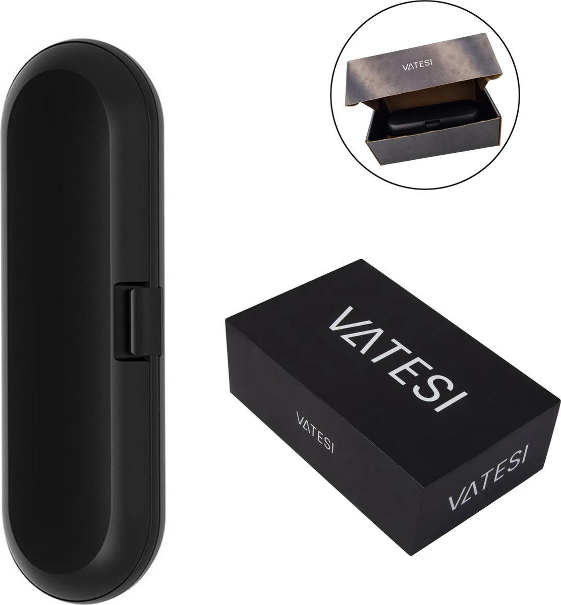 De VATESI® Reisetui is uiterst geschikt om je elektrische tandenborstel in te bewaren voor als je op reis gaat. De reisetui is geschikt voor vele elektrische tandenborstels van Oral B (onderaan kun je een lijst met geschikte tandenborstel vinden). Naast de tandenborstel kan je ook nog twee opzetborstels in de reisetui kwijt. Door de kleine gaatjes die aan beide uiteinden zit blijven je borstels niet vochtig maar drogen ze mooi op na gebruik.