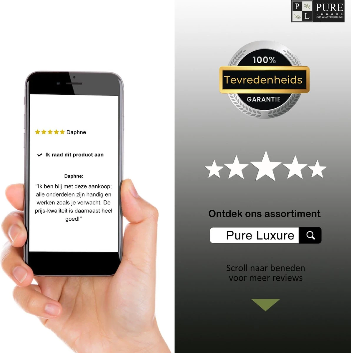 Wij staan achter onze producten en de kwaliteit ervan. Daarom gaan we ervan uit dat jij tevreden bent. Ben je onverhoopt toch niet tevreden? Geen zorgen, wij bieden een 30 dagen ‘’niet goed, geld terug’’ garantie aan en een 100% tevredenheidsgarantie.