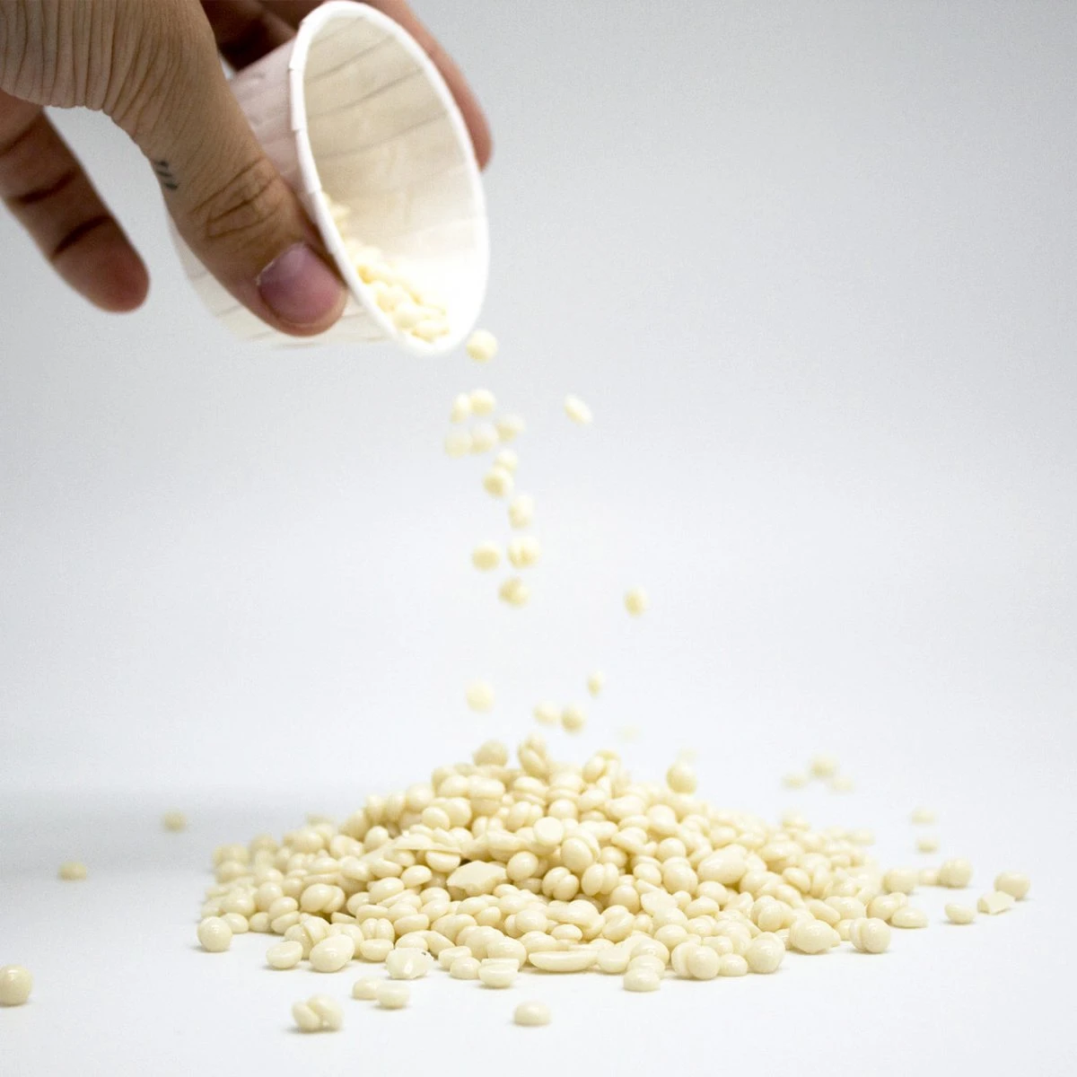 - Verwarm de wax in de bijgeleverde potjes, de waxbolletjes hoeven maar zo heet te zijn dat ze smelten, d.w.z. ca. 45 graden.