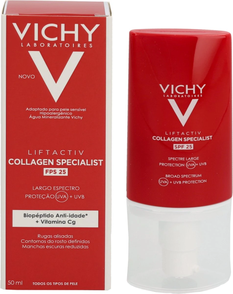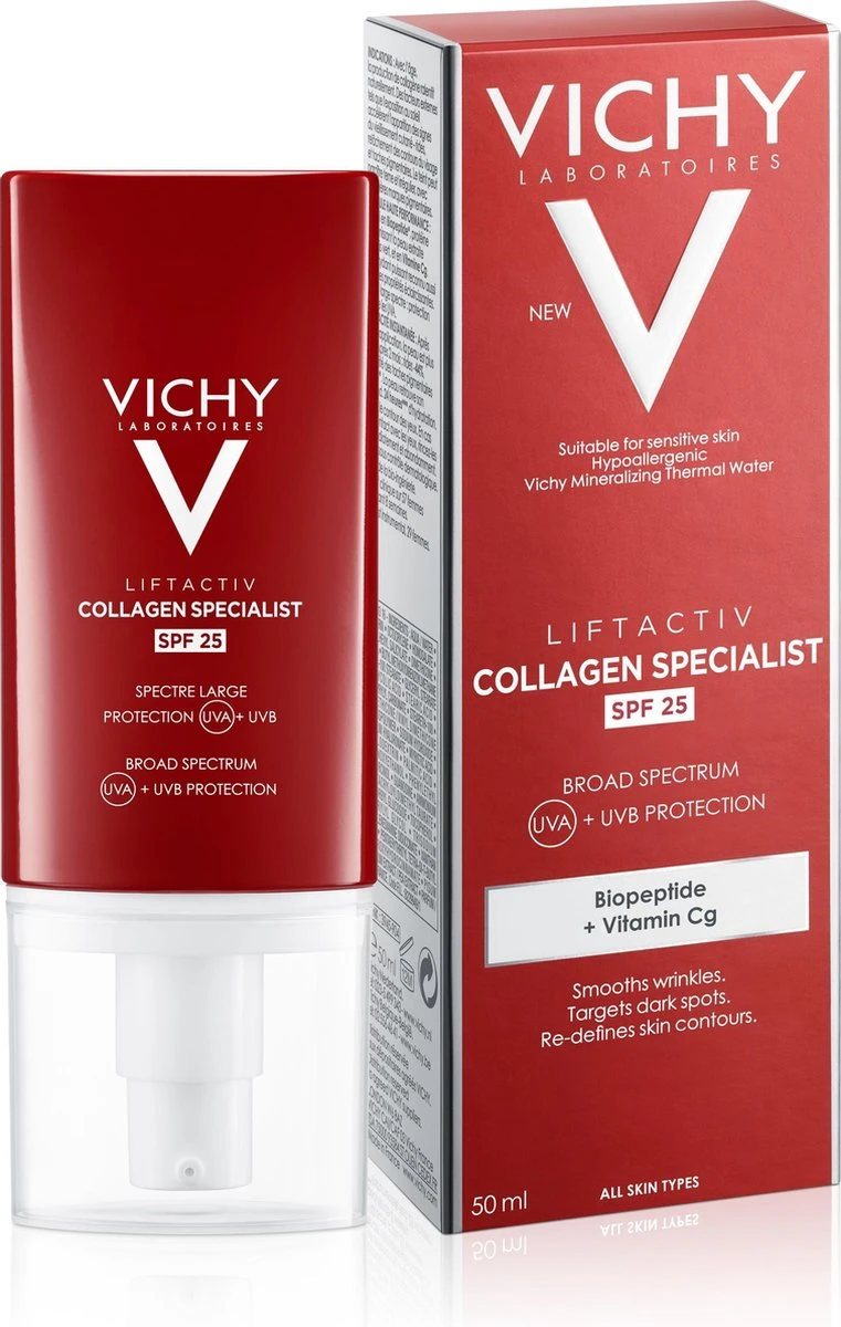 Vichy’s Liftactiv Collagen Specialist SPF25 helpt zichtbare tekenen van huidveroudering door collageenverlies tegengaan. In deze baanbrekende, vernieuwde formule worden anti-aging biopeptiden (huidproteïnen uit groene erwten) en antioxidant vitamine Cg gecombineerd met breed-spectrum SPF25.
